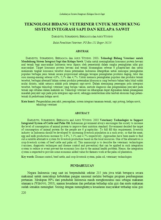 | Judul | Teknologi bidang veteriner untuk mendukung sistem integrasi sapi dan kelapa sawit. / Darminto; Suhardono; Beriajaya; Wiyono, Agus(Balai Penelitian Veteriner, Bogor (Indonesia)). |