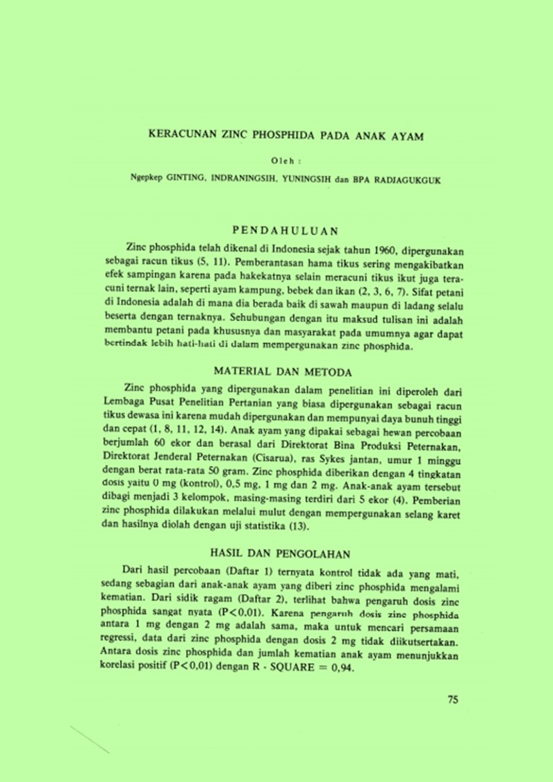 | 245 | # | # | $a Keracunan zinc phosphida pada anak ayam. /$c Ginting, Ngepkep; Indraningsih; Yuningsih; Radjagukguk, B.P.A.(Balai Penelitian Veteriner, Bogor Indonesia). |