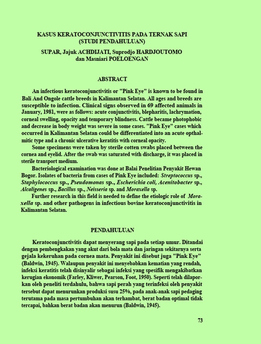 | Judul | Kasus keratoconjunctivitis pada ternak sapi (studi pendahuluan). / Supar; Achdijati, Jajuk; Hardjoutomo, Suprodjo; Poeloengan, Masniari(Balai Penelitian Veteriner, Bogor Indonesia). |