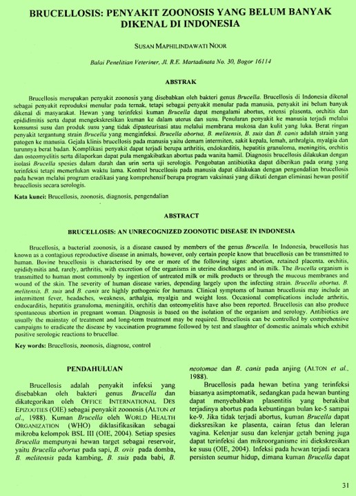 | Abstrak | Brucellosis, a bacterial zoonosis, is a disease caused by members of the genus Brucella. In Indonesia, brucellosis has known as a contagious reproductive disease in animals, however, only certain people know that brucellosis can be transmitted to human. Bovine brucellosis is characterised by one or more of the following signs: abortion, retained placenta . orchitis, epididymitis and, rarely, arthritis, with excretion of the organisms in uterine discharges and in milk . The Brucella organism is transmitted to human most commonly by ingestion of untreated milk or milk products or through the mucous membranes and wound of the skin. The severity of human disease varies, depending largely upon the infecting strain . Brucella abortus, B. melitensis. B. suis and B. canis are highly pathogenic for humans. Clinical symptoms of human brucellosis may include an intermittent fever, headaches, weakness, arthalgia, myalgia and weight loss . Occasional complications include arthritis, endocarditis, hepatitis granulo |