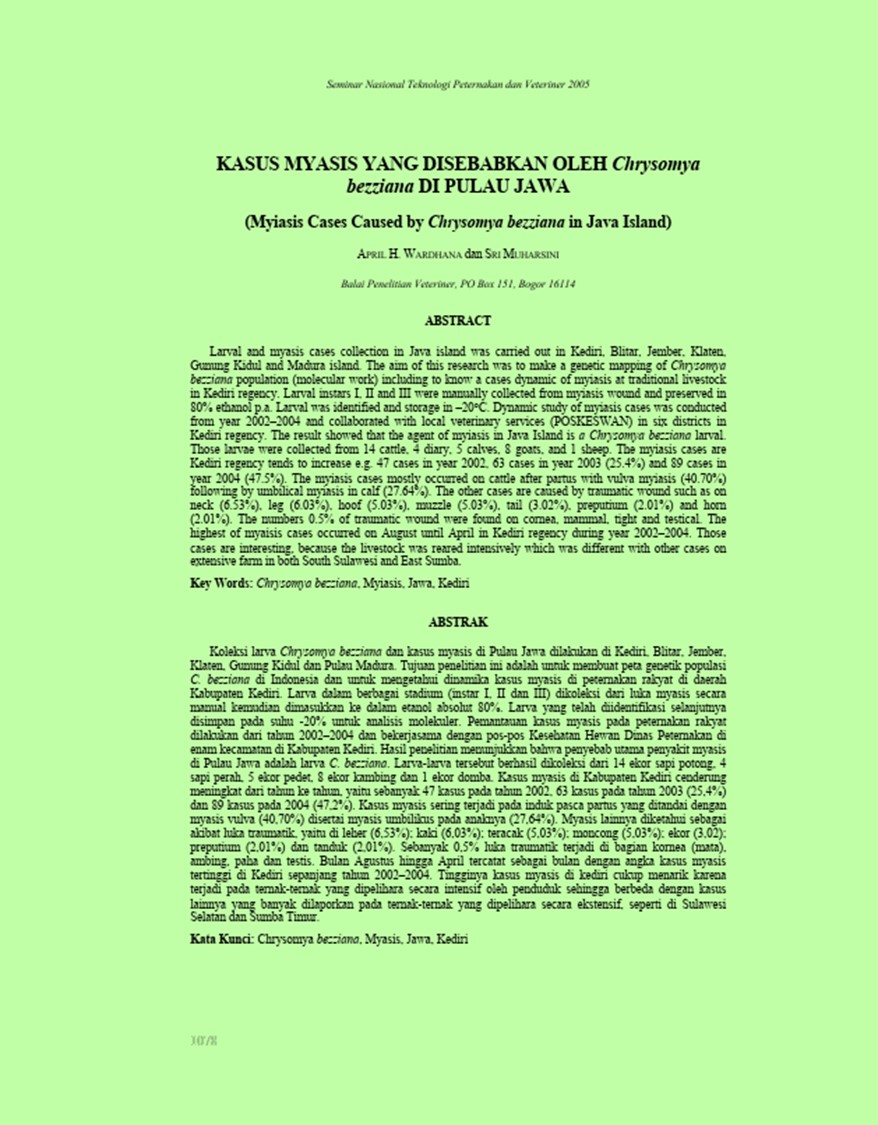 | Judul | Kasus myasis yang disebabkan oleh Chrysomya bezziana di pulau Jawa. / Wardhana, April H.; Muharsini, Sri (Balai Penelitian Veteriner, Bogor Indonesia). |