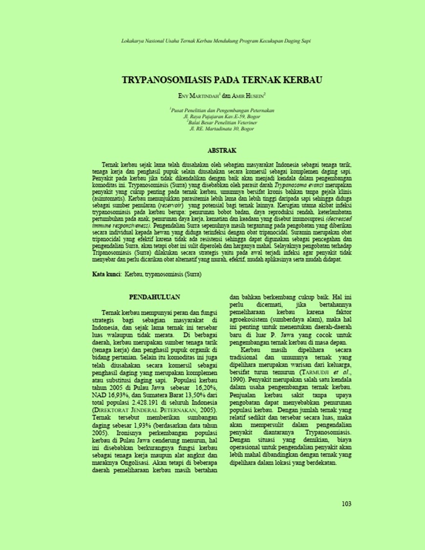 | Judul | Trypanosomiasis pada ternak kerbau. / Martindah, Eny; Husein, Amir(Balai Penelitian Veteriner, Bogor Indonesia). |