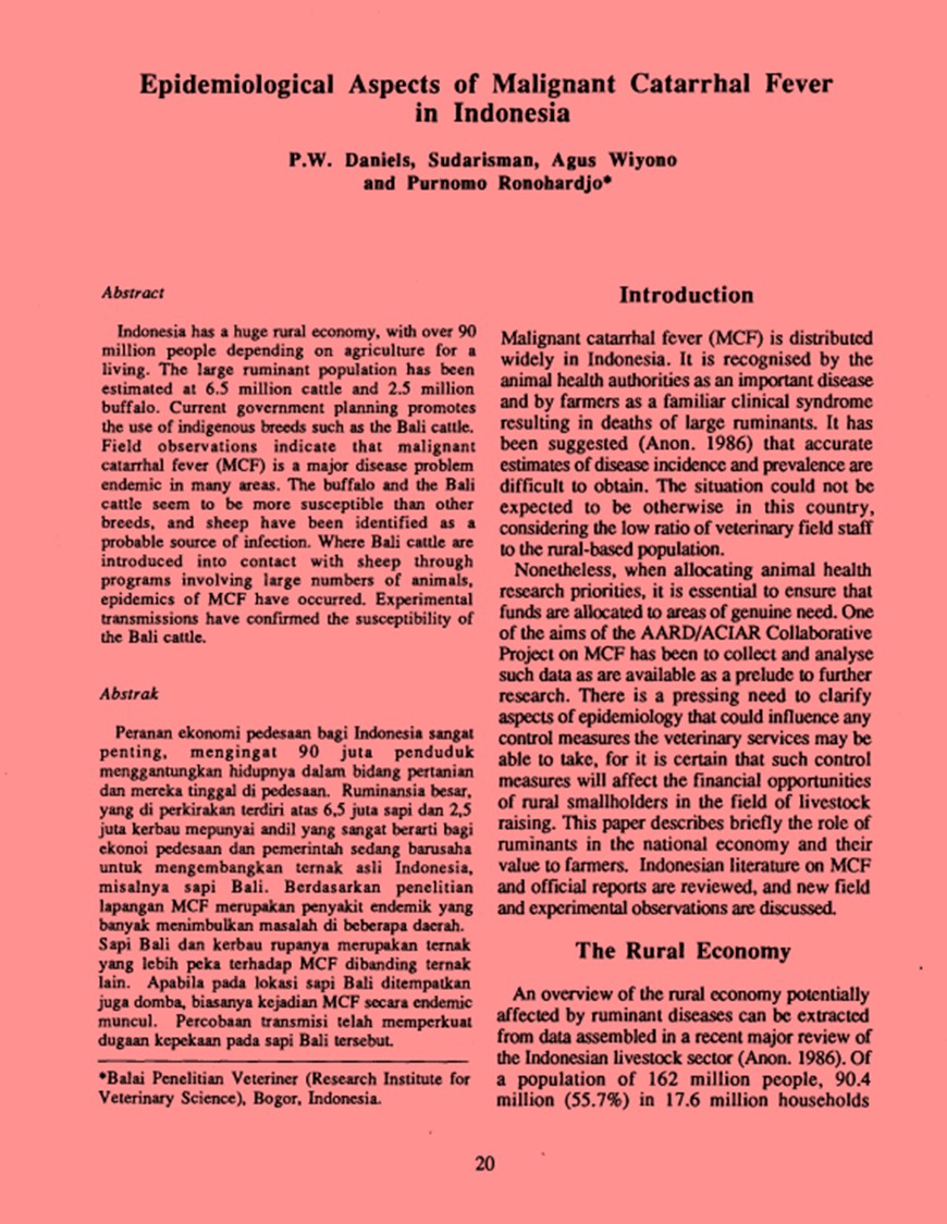 | Judul | Epidemiological Aspect of Malignant Catarrhal Fever in Indonesia / Daniels, Peter W.; Sudarisman; Wiyono, Agus; Ronohardjo, Purnomo |