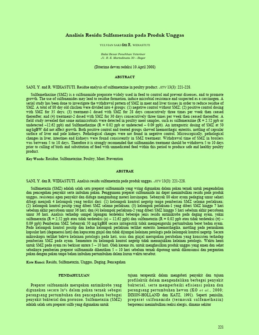 | Judul | Analisis Residu Sulfametazin pada produk unggas. / Sani, Yulvian; Widiastuti, Raphaela(Balai Besar Penelitian Veteriner, Bogor Indonesia). |