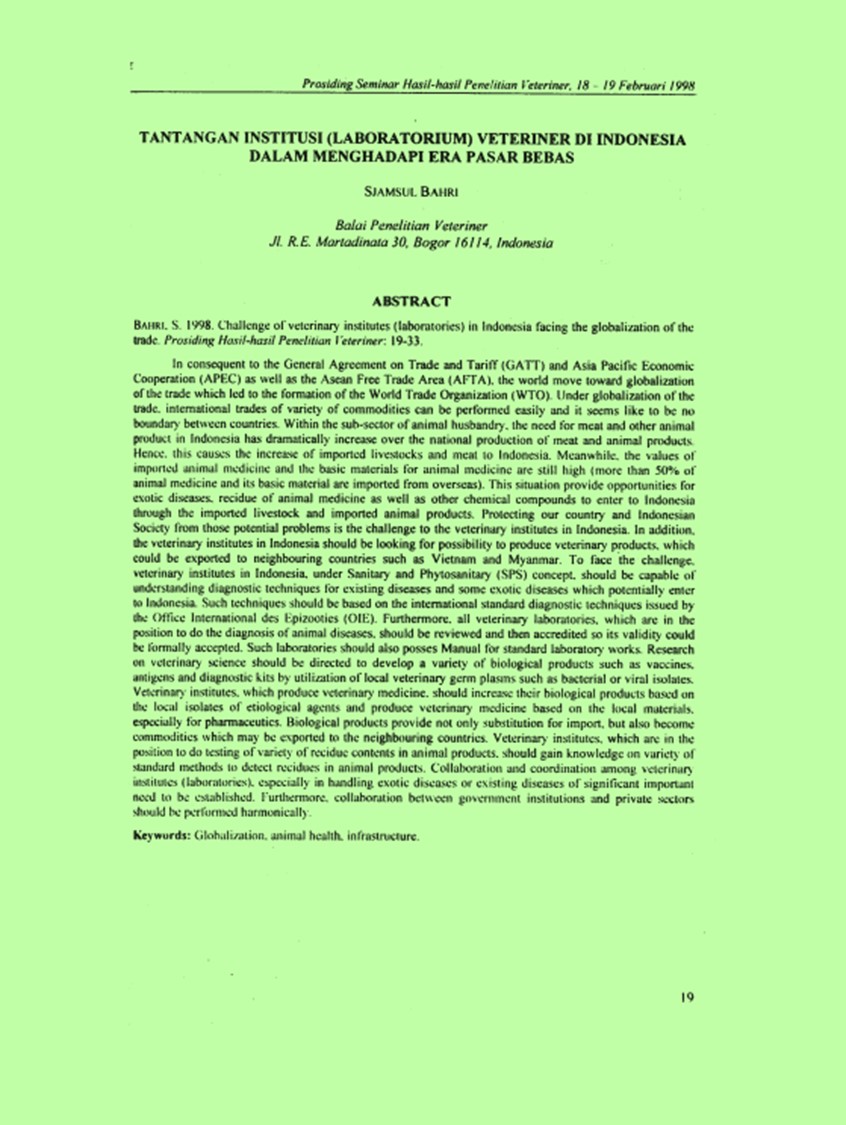 $a 13Amu, S. 1998. Challenge of veterinary institutes (laboratories) in Indonesia facing the globalization of the