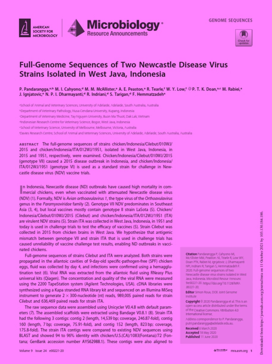 | Judul | Full-Genome Sequences of Two Newcastle Disease Virus Strains Isolated in West Java Indonesia / P. Pandarangga; J. Ignjatovic; M. I. Cahyono; Dharmayanti, NLP; M. M. McAllister; Indriani, Risa; A. E. Peaston; Tarigan, Simson; R. Tearle; F. Hemmatzadeh; W. Y. Low; P. T. K. Doan; M. Rabiei. |