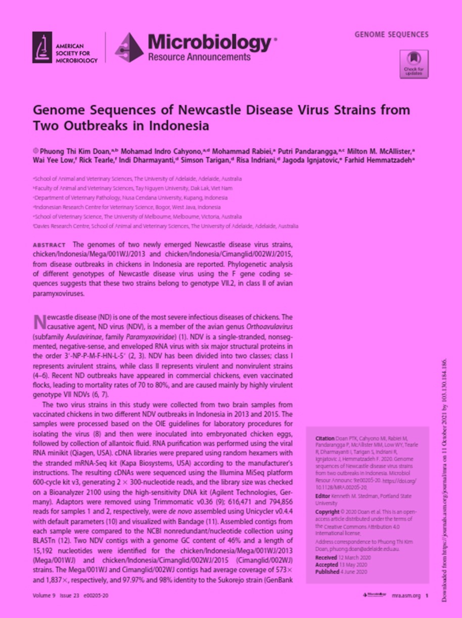 | Judul | Genome Sequences of Newcastle Disease Virus Strains from Two Outbreaks in Indonesia / Phuong Thi Kim Doan; Wai Yee Low; Rick Tearle; Mohamad Indro Cahyono; Dharmayanti, NLP; Mohammad Rabiei; Simson Tarigan; Risa Indriani; Putri Pandarangga; Jagoda Ignjatovic; Milton M. McAllister; Farhid Hemmatzadeh. |