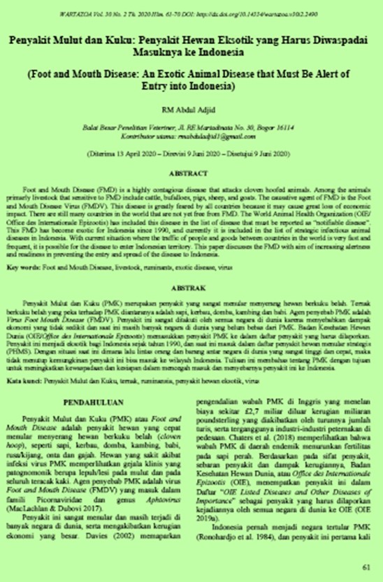 | 520 | # | # | $a Penyakit Mulut dan Kuku (PMK) merupakan penyakit yang sangat menular menyerang hewan berkuku belah. Ternak berkuku belah yang peka terhadap PMK diantaranya adalah sapi, kerbau, domba, kambing dan babi. Agen penyebab PMK adalah Virus Foot Mouth Disease (FMDV). Penyakit ini sangat ditakuti oleh semua negara di dunia karena menyebabkan dampak ekonomi yang tidak sedikit dan saat ini masih banyak negara di dunia yang belum bebas dari PMK. Badan Kesehatan Hewan Dunia (OIE/Office des Internationale Epizootis) memasukkan penyakit PMK ke dalam daftar penyakit yang harus dilaporkan. Penyakit ini menjadi eksotik bagi Indonesia sejak tahun 1990, dan saat ini masuk dalam daftar penyakit hewan menular strategis (PHMS). Dengan situasi saat ini dimana lalu lintas orang dan barang antar negara di dunia yang sangat tinggi dan cepat, maka tidak menutup kemungkinan penyakit ini bisa masuk ke wilayah Indonesia. Tulisan ini membahas tentang PMK dengan tujuan untuk meningkatkan kewaspadaan dan kesiapan dalam mencegah masuk dan menyebarnya penyakit ini ke Indonesia. |
