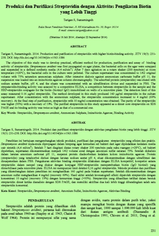 | Judul | Produksi dan Purifikasi Streptavidin dengan Aktivitas Pengikatan Biotin yang Lebih Tinggi / Tarigan, Simson; Sumarningsih (Balai Besar Penelitian Veteriner) |