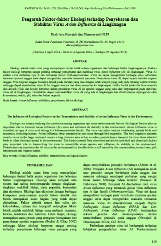| Judul | Pengaruh Faktor-faktor Ekologi terhadap Penyebaran dan Stabilitas Virus Avian Influenza di Lingkungan / Hewajuli, Dyah Ayu; Dharmayanti, NLP Indi (Balai Besar Penelitian Veteriner) |