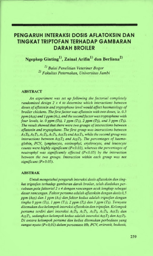 | Judul | Pengaruh Interaksi Dosis Aflatoksin dan Tingkat Triptofan Terhadap Gambaran Darah Broiler / Ngepkep,Ginting; Arifin,Zainal; Berliana (Balai Penelitian Veteriner) |