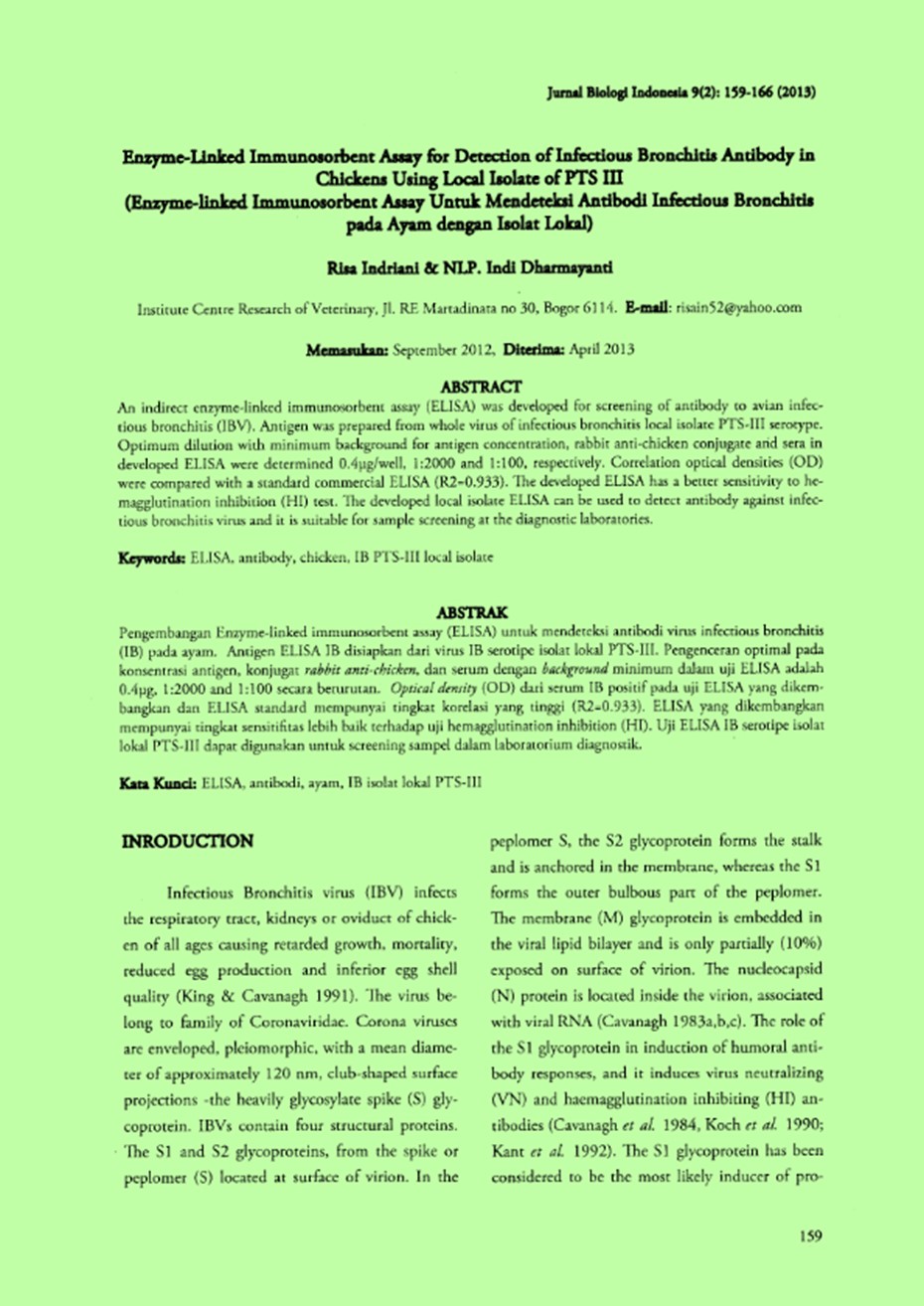 | Subjek | ELISA, antibody, chicken, IB PTS-III local isolate |
