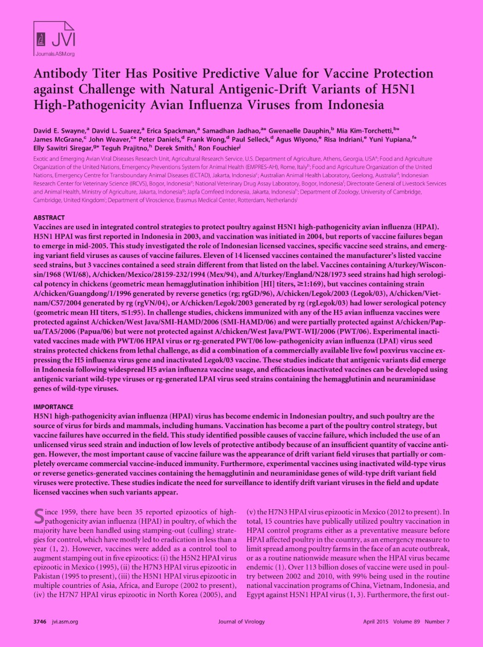 245 # # $a Antibody Titer Has Positive Predictive Value for Vaccine Protection against Challenge with Natural Antigenic-Drift Variants of H5N1 High-Pathog enicity Avian Influenza Viruses from Indonesia /$c David E. Swayne; David L. Suarez; Erica Spackman; Samadhan Jadhao; Gwenaelle Dauphin; Mia Kim-Torchetti; James McGrane; John Weaver; Peter Daniels; Frank Wong; Paul Selleck; Agus Wiyono; Risa Indriani; Yuni Yupiana; Elly Sawitri Siregar; Teguh Prajitno; D