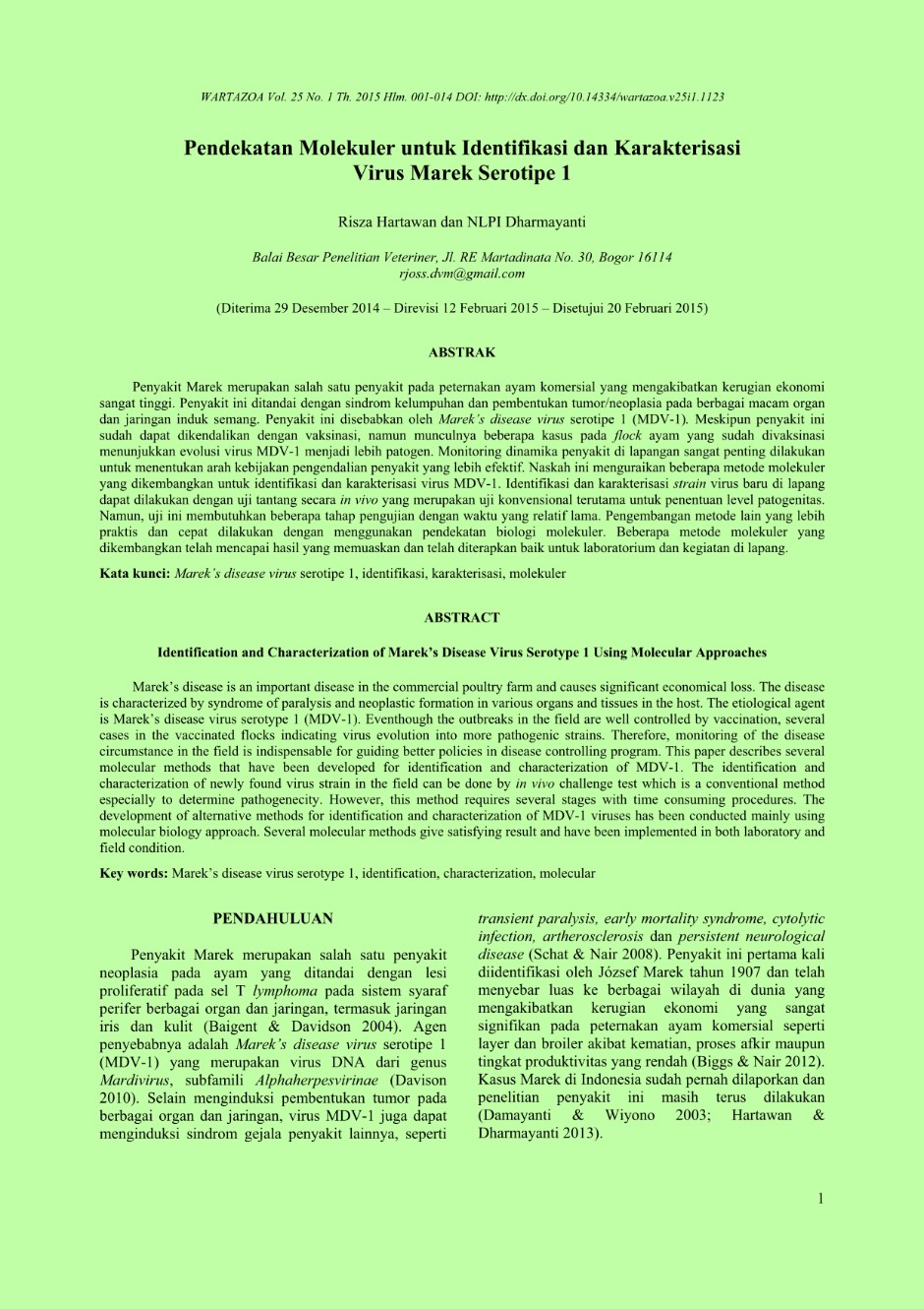 | Subjek | Marek’s disease virus serotipe 1, identifikasi, karakterisasi, molekuler |
