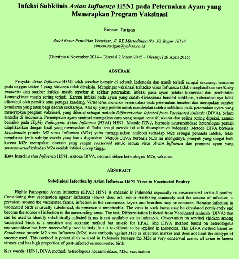 Abstrak Penyakit Avian Influenza H5N1 telah tersebar hampir di seluruh Indonesia dan masih terjadi sampai sekarang, terutama pada unggas sektor-4 yang biasanya tidak divaksin. Mengingat vaksinasi terhadap virus Influenza tidak menghasilkan sterilizingimmunity dan sumber infeksi masih tersebar di sekitar peternakan, infeksi pada ayam petelur komersial dan pembibitan kemungkinan masih sering terjadi. Karena infeksi pada ayam yang sudah divaksinasi bersifat subklinis, keberadaannya tidak diketahui oleh pemilik atau petugas kandang. Virus terus menerus bersirkulasi pada peternakan tersebut dan merupakan sumber penularan yang laten bagi daerah sekitarnya. Alat uji yang praktis untuk mendeteksi infeksi subklinis pada peternakan ayam yang menerapkan program vaksinasi, yang dikenal sebagai metode Differentiation Infected from Vaccinated Animals (DIVA), belumtersedia di Indonesia. Penempatan ayam sentinel merupakan cara yang sangat sensitif, akurat dan paling sering dipakai, namunberisiko pada Highly Pathogenic Avian