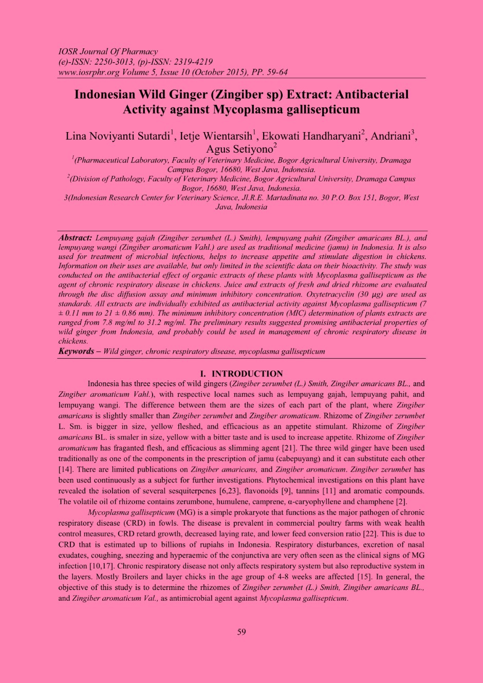 | Judul | Indonesian Wild Ginger (Zingiber sp) Extract: Antibacterial Activity against Mycoplasma gallisepticum / Sutardi, Lina N.; W. Ietje; H. EKowati; Andriani (Balai Besar Penelitian Veteriner); Setiyono, Agus |
