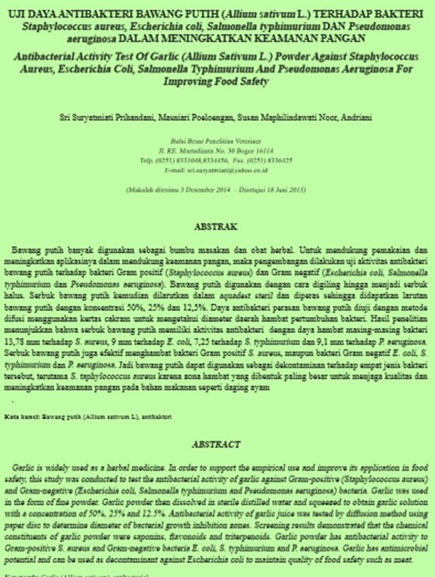 | Judul | Uji Daya Antibakteri Bawang Putih (Allium Sativum L.) Terhadap Bakteri Staphylococcus Aureus, Escherichia Coli, Salmonella Typhimurium dan Pseudomonas Aeruginosa dalam Meningkatkan Keamanan Pangan / Prihandani, Sri Suryatmiati; Poeloengan, Masniari; Noor, Susan Maphilindawati; Andriani (BBLITVET) |