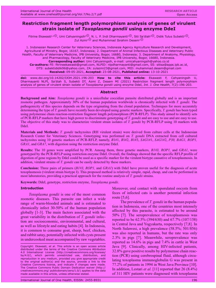 | Abstrak | Background and Aim: Toxoplasma gondii is a unicellular coccidian parasite distributed globally and is an important zoonotic pathogen. Approximately 30% of the human population worldwide is chronically infected with T. gondii. The pathogenicity of this species depends on the type originating from the clonal population. Techniques for more accurately determining the type of T. gondii have recently been developed using genetic markers. Specifically, T. gondii has been typed using polymerase chain reaction-restriction fragment length polymorphism (PCR-RFLP). This study aimed to identify sets of PCR-RFLP markers that have high power to discriminate genotyping of T. gondii and are easy to use and are easy to use. The objective of this study was to characterize virulent strain isolates of T. gondii by PCR-RFLP using 10 markers with DdeI. Materials and Methods: T. gondii tachyzoites (RH virulent strain) were derived from culture cells at the Indonesian Research Center for Veterinary Sciences. Genot |