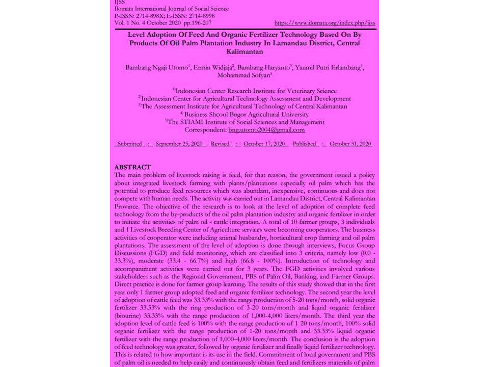 520 # # $a The main problem of livestock raising is feed, for that reason, the government issued a policy about integrated livestock farming with plants/plantations especially oil palm which has the potential to produce feed resources which was abundant, inexpensive, continuous and does not compete with human needs. The activity was carried out in Lamandau District, Central Kalimantan Province. The objective of the research is to look at the level of adoption of complete feed technology from the by-products of the oil palm plantation industry and organic fertilizer in order to initiate the activities of palm oil - cattle integration. A total of 10 farmer groups, 3 individuals and 1 Livestock Breeding Center of Agriculture services were becoming cooperators. The business activities of cooperator were including animal husbandry, horticultural crop farming and oil palm plantations. The assessment of the level of adoption is done through interviews, Focus Group Discussions (FGD) and field monitoring, which are classified into 3 criteria, namely low (0.0 -33.3%), moderate (33.4 - 66.7%) and high (66.8 - 100%). Introduction of technology and accompaniment activities were carried out for 3 years. The FGD activities involved various stakeholders such as the Regional Government, PBS of Palm Oil, Banking, and Farmer Groups. Direct practice is done for farmer group learning. The results of this study showed that in the first year only 1 farmer group adopted feed and organic fertilizer technology. The second year the level of adoption of cattle feed was 33.33% with the range production of 5-20 tons/month, solid organic fertilizer 33.33% with the ring production of 3-20 tons/month and liquid organic fertilizer (biourine) 33.33% with the range production of 1,000-4,000 liters/month. The third year the adoption level of cattle feed is 100% with the range production of 1-20 tons/month, 100% solid organic fertilizer with the range production of 1-20 tons/month and 33.33% liquid organic fertilizer with the range production of 1,000-4,000 liters/month. The conclusion is the adoption of feed technology was greater, followed by organic fertilizer and finally liquid fertilizer technology. This is related to how important is its use in the field. Commitment of local government and PBS of palm oil is needed to help easily and continuously obtain feed and fertilizers materials of palm oil mill byproduct and facilitating marketing of their products. Key words: Adoption of technology, farmer groups, Complete feed, organic fertilizer, oil palm