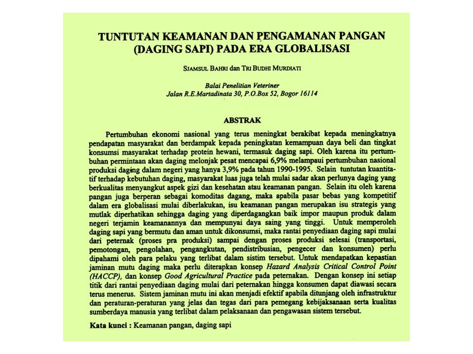 | Judul | TUNTUTAN KEAMANAN DAN PENGAMANAN PANGAN (DAGING SAPI) PADA ERA GLOBALISASI / Bahri, Sjamsul |