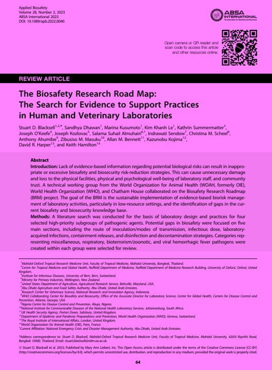 | Abstrak | Introduction: Lack of evidence-based information regarding potential biological risks can result in inappro- priate or excessive biosafety and biosecurity risk-reduction strategies. This can cause unnecessary damage and loss to the physical facilities, physical and psychological well-being of laboratory staff, and community trust. A technical working group from the World Organization for Animal Health (WOAH, formerly OIE), World Health Organization (WHO), and Chatham House collaborated on the Biosafety Research Roadmap (BRM) project. The goal of the BRM is the sustainable implementation of evidence-based biorisk manage- ment of laboratory activities, particularly in low-resource settings, and the identi?cation of gaps in the cur- rent biosafety and biosecurity knowledge base. Methods: A literature search was conducted for the basis of laboratory design and practices for four selected high-priority subgroups of pathogenic agents. Potential gaps in biosafety were focused on ?ve main sections, includin |
