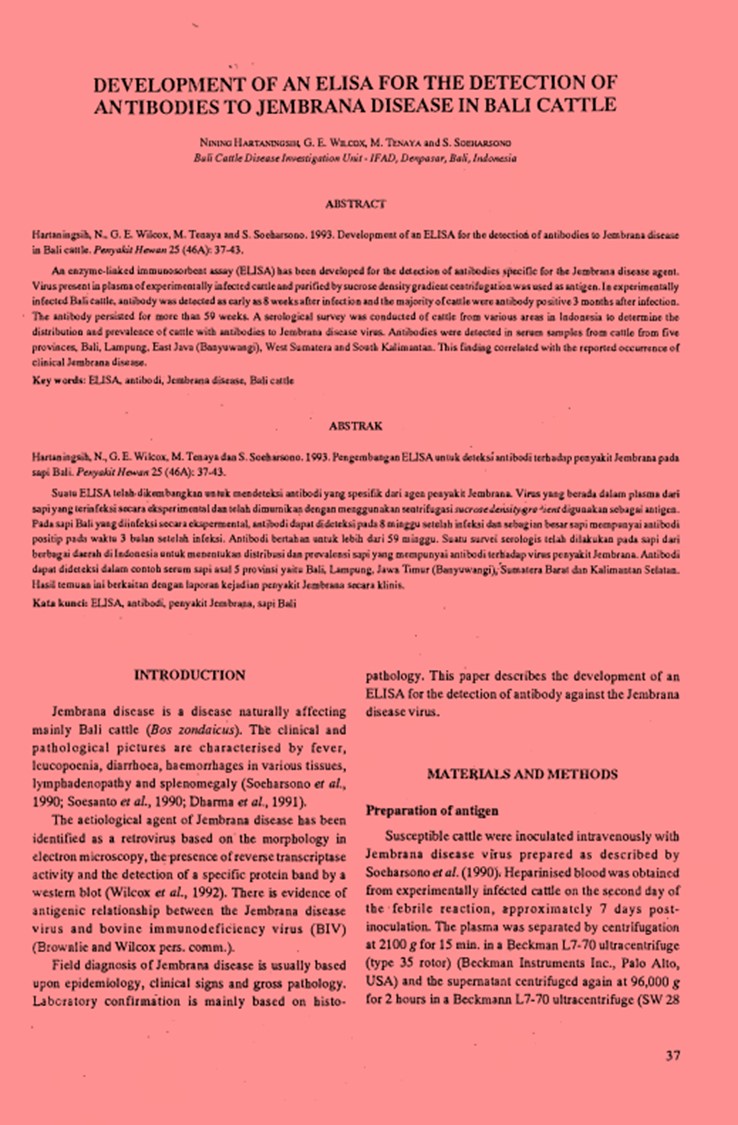 | Judul | DEVELOPMENT OF AN ELISA FOR THE DETECTION OF ANTIBODIES TO JEMBRANA DISEASE IN BALI CATTLE / NINING HARTANINGSIH |