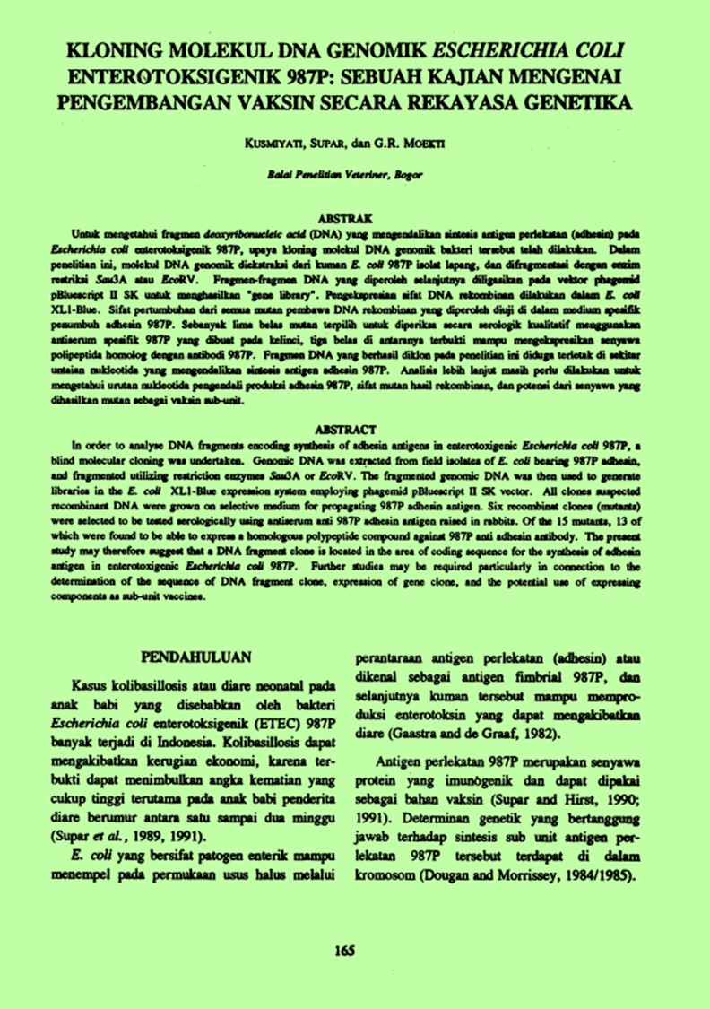 | Abstrak | In order to analyse DNA fragments encoding synthesis of adhesin antigens in enterotoxigenic Escherichia cell 987P, a blind molecular cloning was undertaken. Genomic DNA was extracted from field isolates of E. coil bearing 987P adhesin, and fragmented utilizing restriction enzymes Sau3A or EcoRV. The fragmented genomic DNA was then used to generate libraries in the E. coil XL1-Blue expression system employing phagemid pBluescript II SK vector. AU clones suspected recombinant DNA were grown on selective medium for propagating 987P adhesin antigen. Six recombinat clones (mutants) were selected to be tested serologically using antiserum anti 987P adhesin antigen raised in rabbits. Of the 15 mutants, 13 of which were found to be able to express a homologous polypeptide compound against 987P anti adhesin antibody. The present study may therefore suggest that a DNA fragment clone is located in the area of coding sequence for the synthesis of adhesin antigen in enterotoxigenic Escherichia cob 987P. Further st |