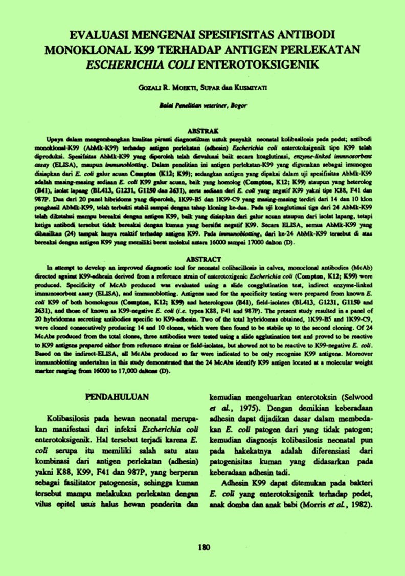 | Judul | EVALUASI MENGENAI SPESIFISTTAS ANTIBODI MONOKLONAL K99 TERHADAP ANTIGEN PERLEKATAN ESCHERICHIA COLI ENTEROTOKSIGENIK / GOZALI R. MOEKTI |