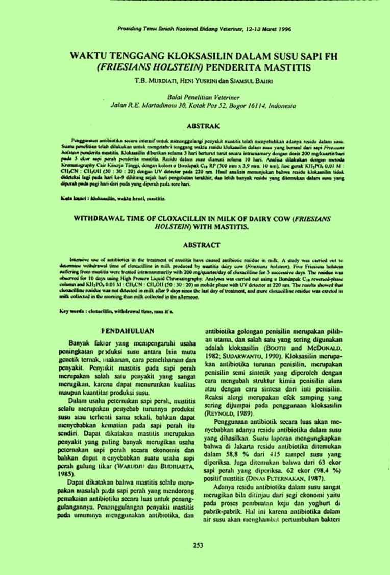 | Judul | WAKTU TENGGANG KLOKSASILIN DALAM SUSU SAPI FH (FRIESIANS HOLSTEIN) PENDERITA MASTITIS / T.B. MURDIATI |