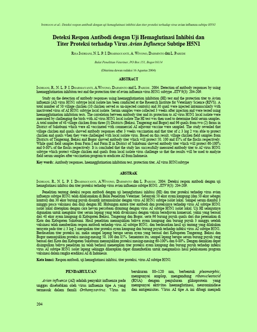Judul Deteksi Respon Antibodi dengan Uji Hemaglutinasi Inhibisi dan Titer Proteksi terhadap Virus Avian Influenza Subtipe H5N1 / RISA INDRIANI
