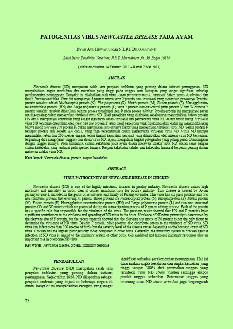 | Judul | PATOGENITAS VIRUS NEWCASTLE DISEASE PADA AYAM / DYAH AYU HEWAJULI |