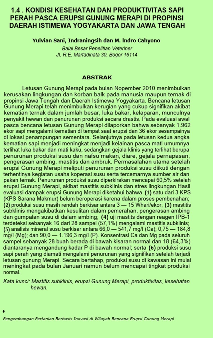 | Judul | 1.4 . KONDISI KESEHATAN DAN PRODUKTIVITAS SAPI PERAH PASCA ERUPSI GUNUNG MERAPI DI PROPINSI DAERAH ISTIMEWA YOGYAKARTA DAN JAWA TENGAH / Yulvian Sani |
