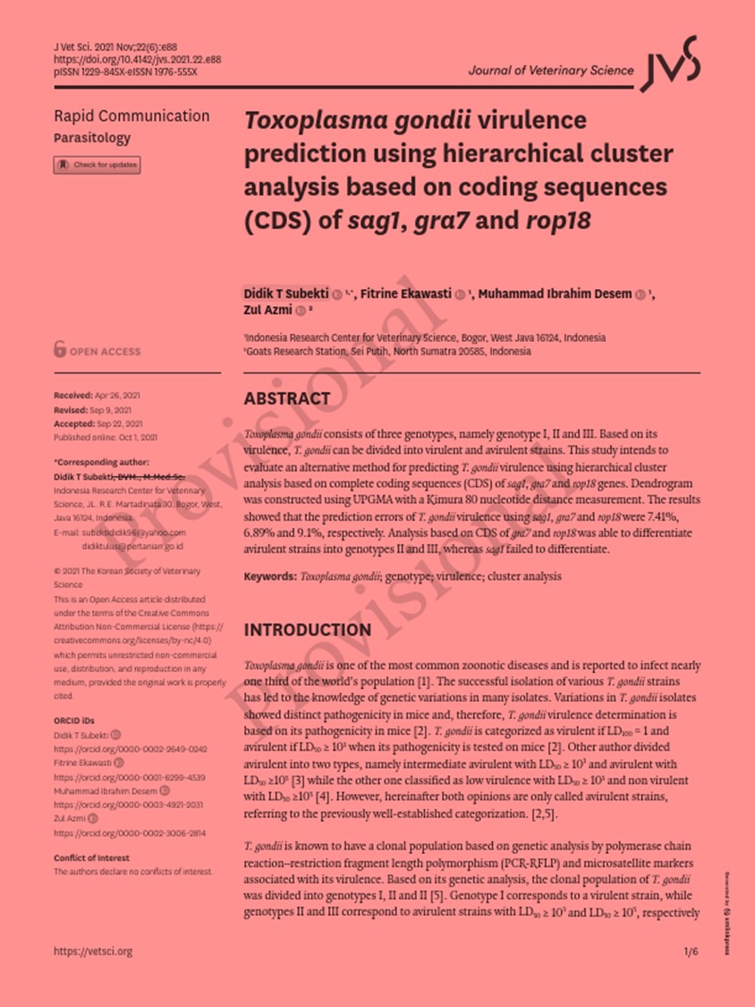 | Judul | Toxoplasma gondii virulence prediction using hierarchical cluster analysis based on coding sequences (CDS) of sag1, gra7 and rop18 / Didik T Subekti 1,* |