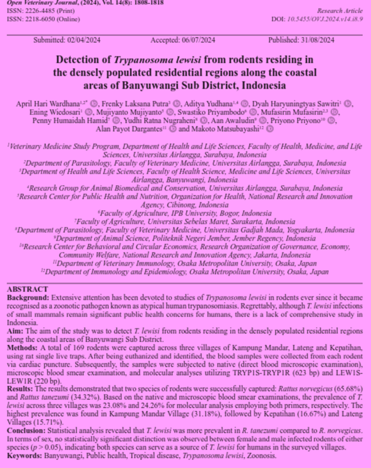 | Abstrak | Background: Extensive attention has been devoted to studies of Trypanosoma lewisi in rodents ever since it became recognised as a zoonotic pathogen known as atypical human trypanosomiasis. Regrettably, although T. lewisi infections of small mammals remain significant public health concerns for humans, there is a lack of comprehensive study in Indonesia. Aim: The aim of the study was to detect T. lewisi from rodents residing in the densely populated residential regions along the coastal areas of Banyuwangi Sub District. Methods: A total of 169 rodents were captured across three villages of Kampung Mandar, Lateng and Kepatihan, using rat single live traps. After being euthanized and identified, the blood samples were collected from each rodent via cardiac puncture. Subsequently, the samples were subjected to native (direct blood microscopic examination), microscopic blood smear examination, and molecular analyses utilizing TRYP1S-TRYP1R (623 bp) and LEW1SLEW1R (220 bp). Results: The results demonstrated that |
