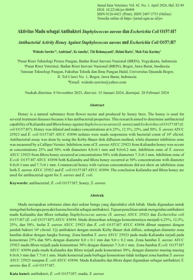 | Judul | Aktivitas Madu sebagai Antibakteri Staphylococcus aureus dan Escherichia Coli O157:H7 / Widodo Suwito |