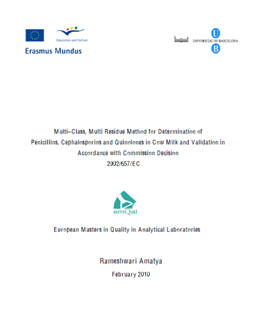 245 1 # $a Multi-class, Multi residue method for determination of Penicillins, Cephalosporins and Quinolones in cow milk and validation in Accordance with commission decision 2002/657/EC /$c AMATYA, Rameshwari