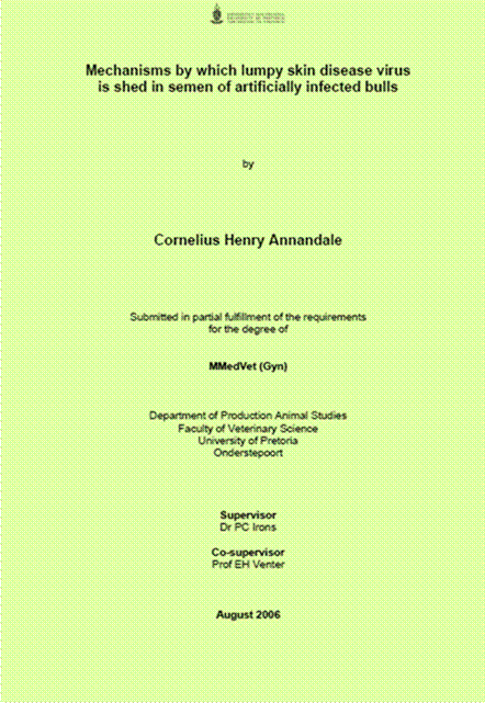 | 245 | 1 | # | $a Mechanisms by which Lumpy Skin Disease virus is seed in semen of artificially infected bulls /$c ANNANDALE, Cornelius Henry |