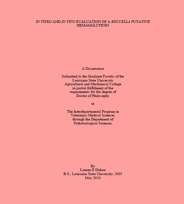 | 245 | 1 | # | $a In Vitro and in vivo evaluation of a Brucella putative hemagglutinin /$c DUHON, Lauren E |