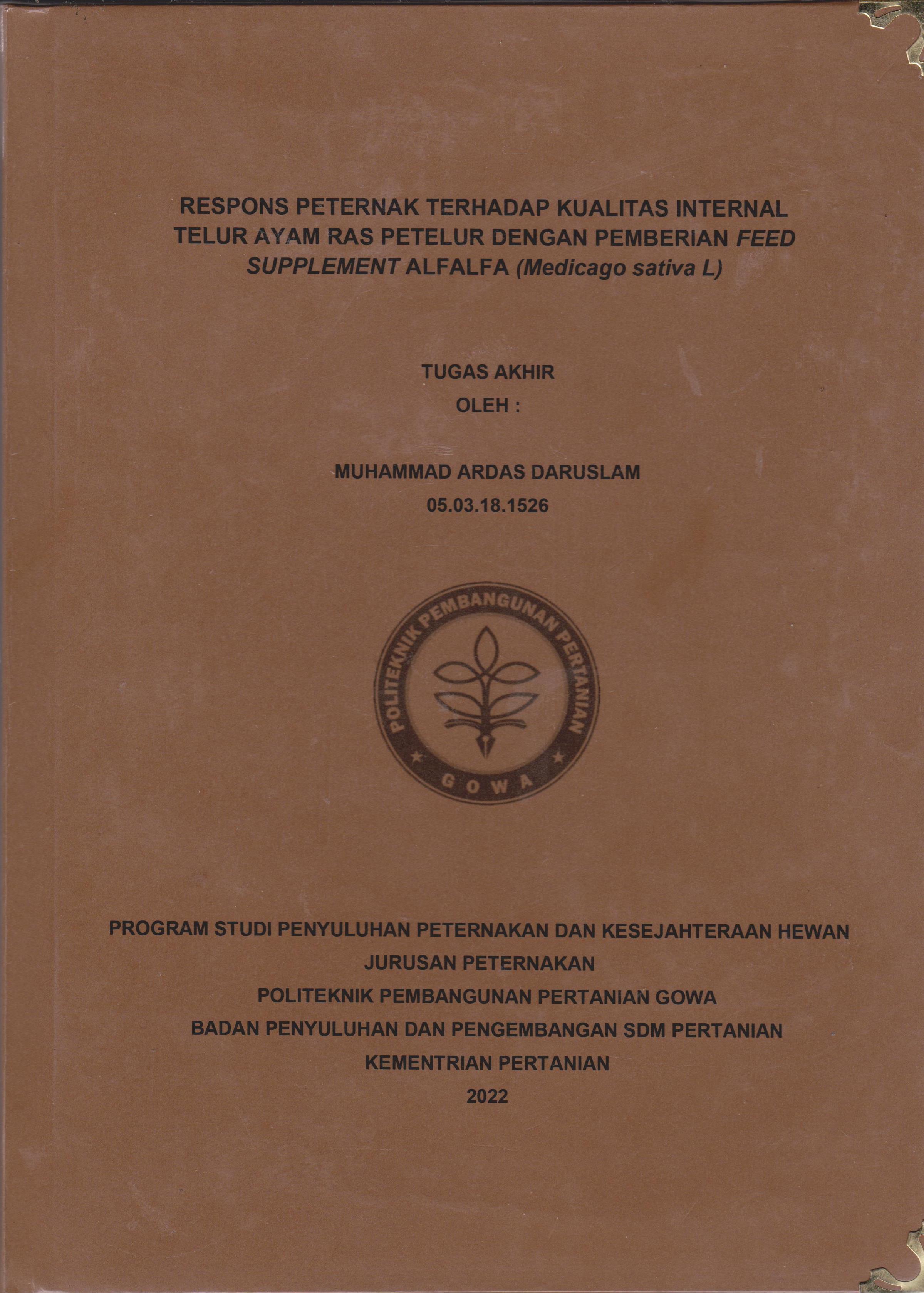 Judul | RESPONS PETERNAK TERHADAP KUALITAS INTERNAL TELUR AYAM RAS PETELUR DENGAN PEMBERIAN FEED SUPPLEMENT ALFALFA (Medicago sativa L) / MUHAMMAD ARDAS DARUSLAM |