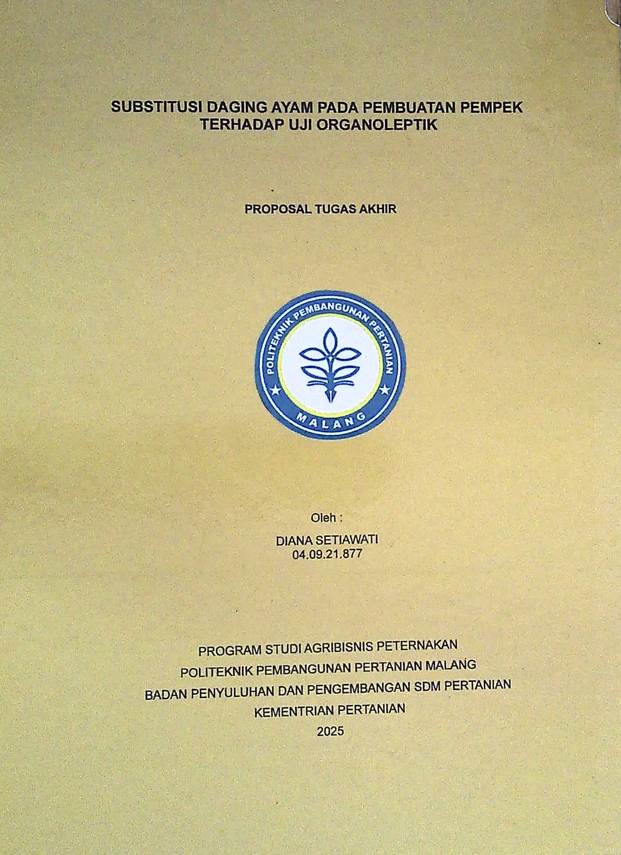 SUBSTITUSI DAGING AYAM PADA PEMBUATAN PEMPEK TERHADAP UJI ORGANOLEPTIK / Polbangtan Malang