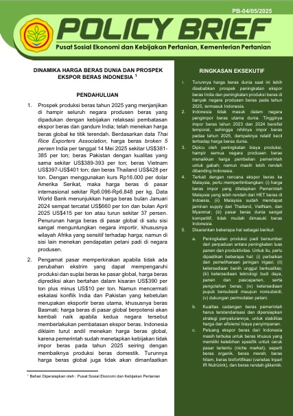 Dinamika Harga Beras Dunia dan Prospek Ekspor Beras Indonesia / Pusat Sosial Ekonomi dan Kebijakan P....