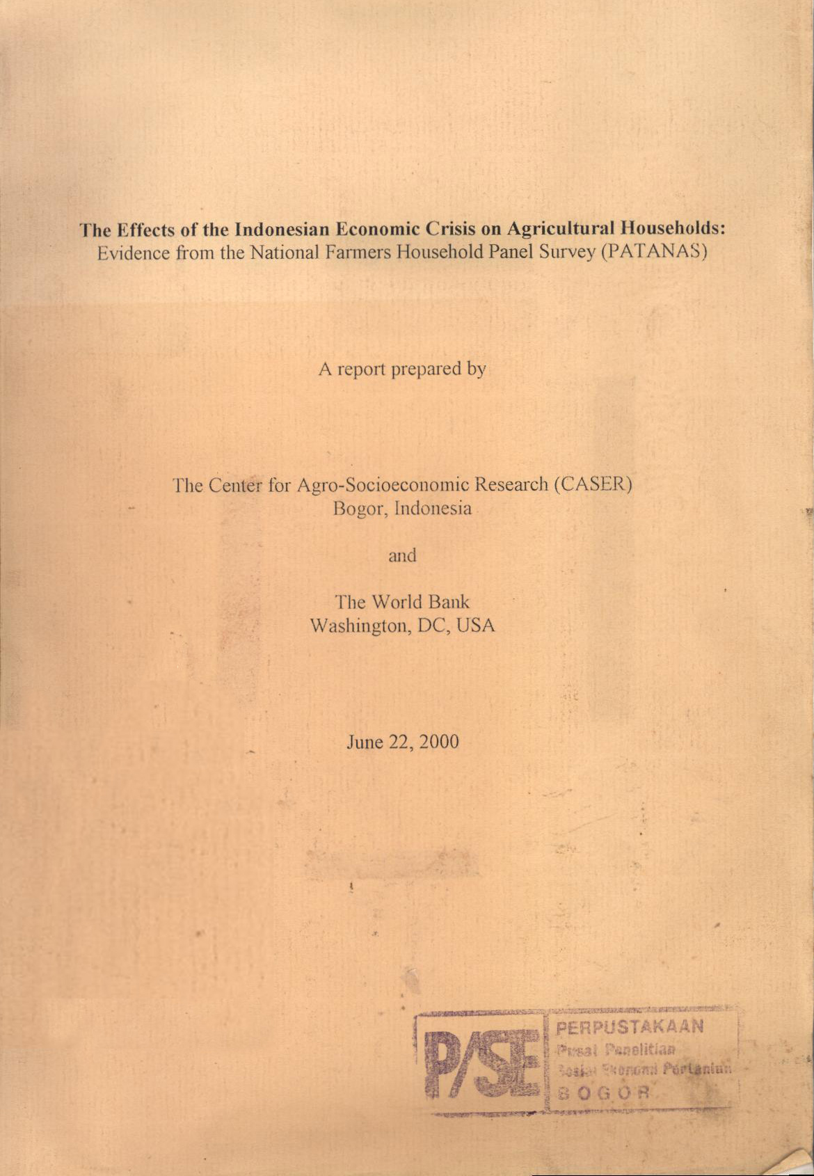 | Judul | The Effects of the Indonesian economic Crisis on Agricultural Households Panel Survey (PATANAS) : Evidence from Nation Farmers Households Panel Survey (PATANAS) / The Centre for Agro-Socioeconomic Research (CASER) and The World Bank |