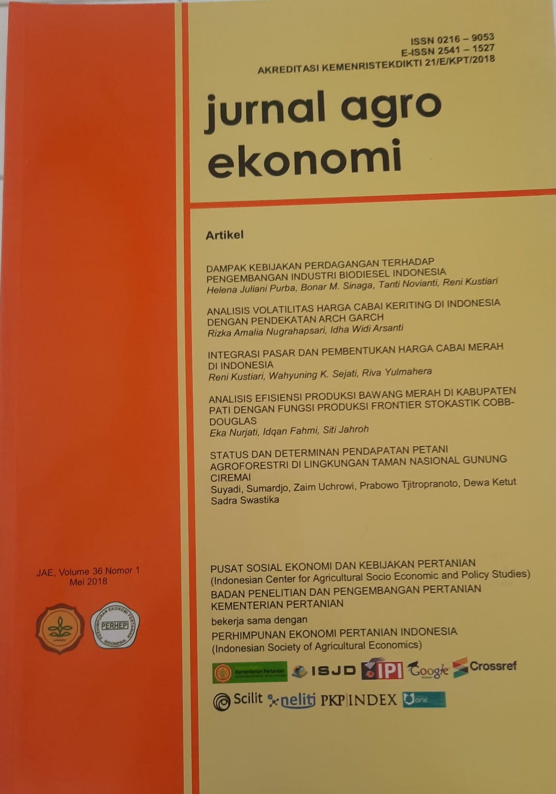 | 520 | # | # | $a DAMPAK KEBIJAKAN PERDAGANGAN TERHADAP PENGEMBANGAN INDUSTRI BIODIESEL INDONESIA Helena Juliani Purba, Bonar M. Sinaga, Tanti Novianti, Reni Kustiari ANALISIS VOLATILITAS HARGA CABAI KERITING DI INDONESIA DENGAN PENDEKATAN ARCH GARCH Rizka Amalia Nugrahapsari, Idha Widi Arsanti INTEGRASI PASAR DAN PEMBENTUKAN HARGA CABAI MERAH DI INDONESIA Reni Kustiari, Wahyuning K. Sejati, Riva Yulmahera ANALISIS EFISIENSI PRODUKSI BAWANG MERAH DI KABUPATEN PATI DENGAN FUNGSI PRODUKSI FRONTIER STOKASTIK COBB- DOUGLAS Eka Nurjati, Idqan Fahmi, Siti Jahroh STATUS DAN DETERMINAN PENDAPATAN PETANI AGROFORESTRI DI LINGKUNGAN TAMAN NASIONAL GUNUNG CIREMAI Suyadi, Sumardjo, Zaim Uchrowi, Prabowo Tjitropranoto, Dewa Ketut Sadra Swastika |