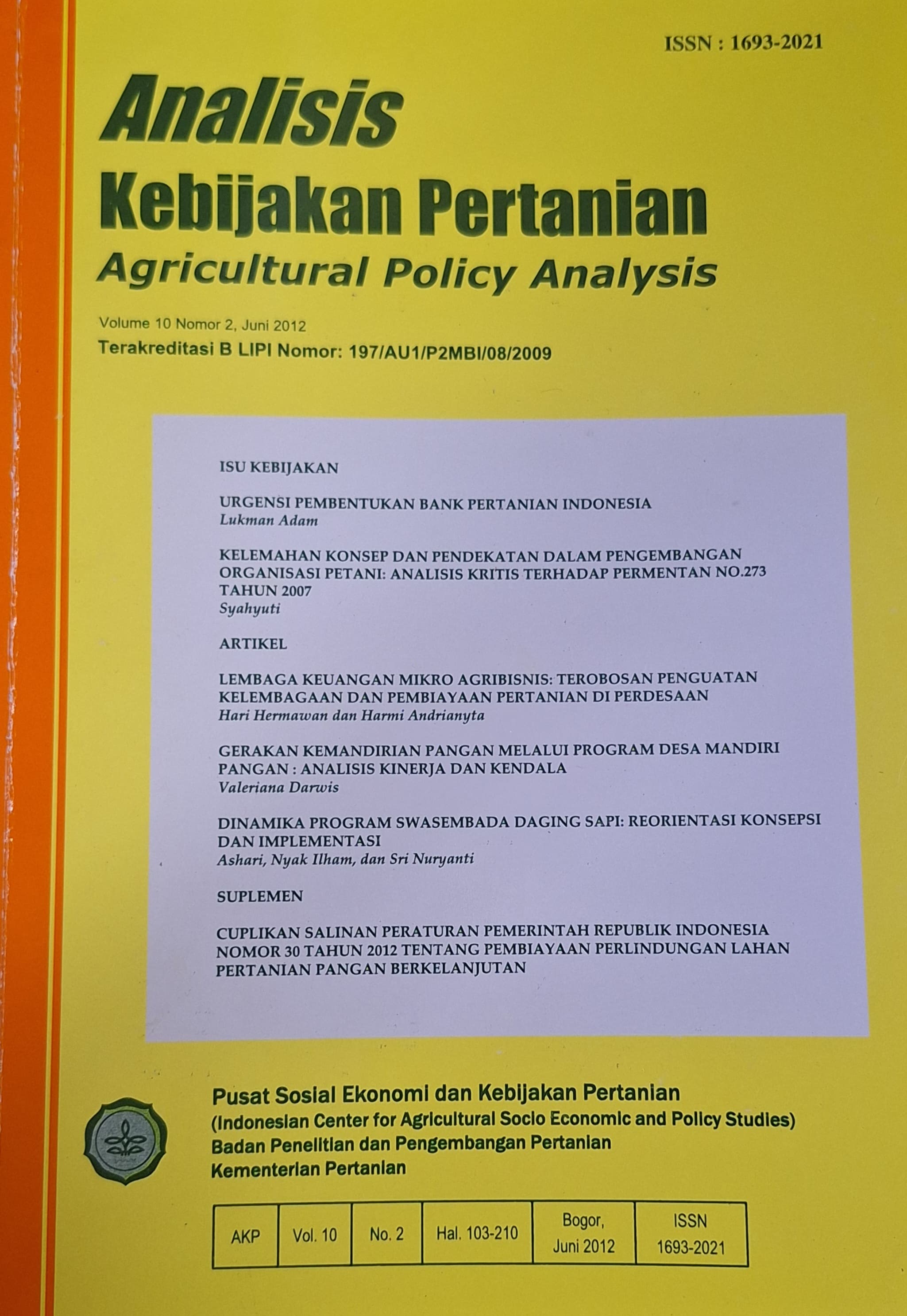| Judul | Analisis Kebijakan Pertanian Volume 10 Nomor 2, 2012 : Agricultural Policy Analysis / Dr. Ir. Handewi P. Saliem |
