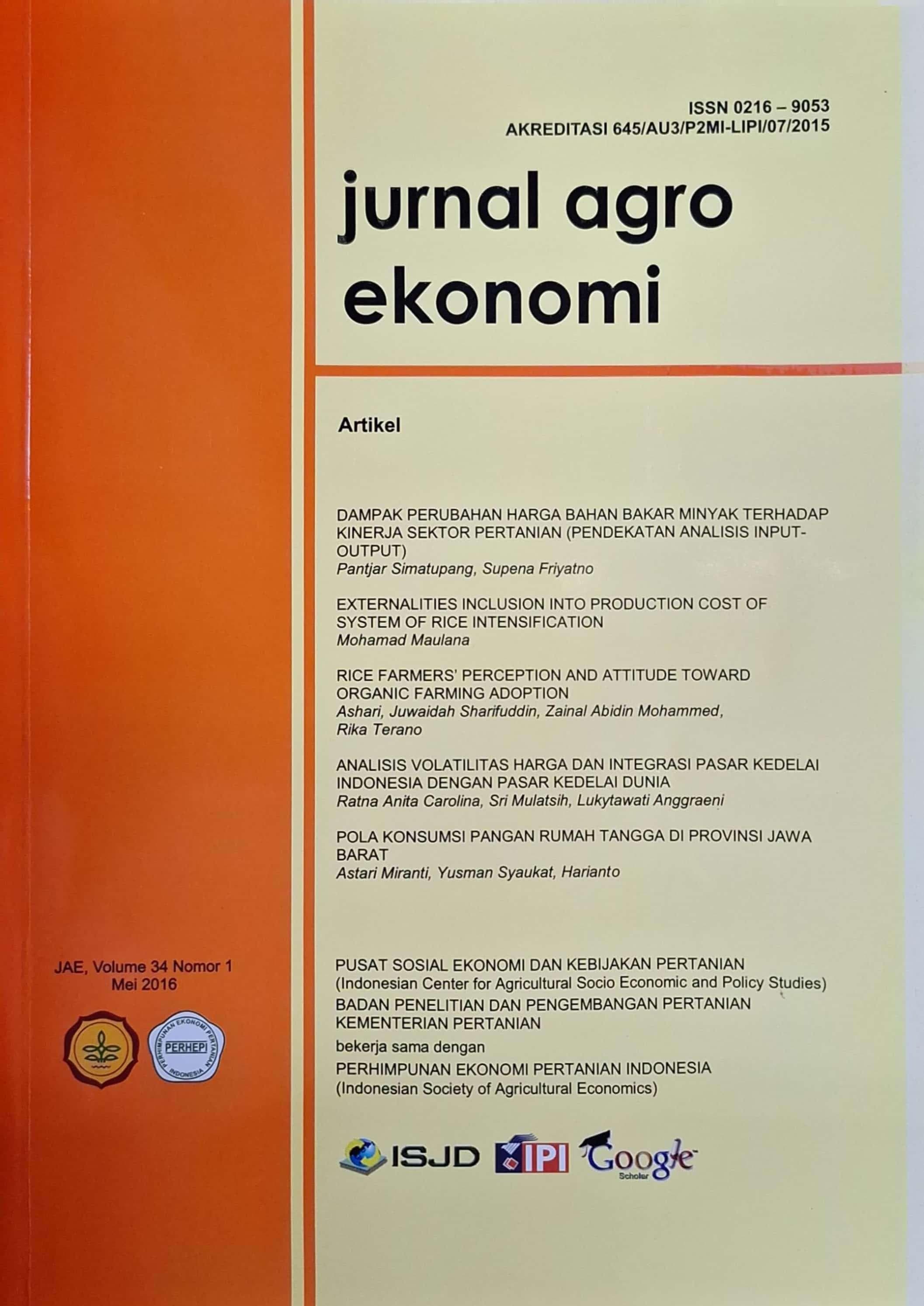 | 520 | # | # | $a DAMPAK PERUBAHAN HARGA BAHAN BAKAR MINYAK TERHADAP KINERJA SEKTOR PERTANIAN (PENDEKATAN ANALISIS INPUT- OUTPUT) Pantjar Simatupang, Supena Friyatno EXTERNALITIES INCLUSION INTO PRODUCTION COST OF SYSTEM OF RICE INTENSIFICATION Mohamad Maulana RICE FARMERS' PERCEPTION AND ATTITUDE TOWARD ORGANIC FARMING ADOPTION Ashari, Juwaidah Sharifuddin, Zainal Abidin Mohammed, Rika Terano ANALISIS VOLATILITAS HARGA DAN INTEGRASI PASAR KEDELAI INDONESIA DENGAN PASAR KEDELAI DUNIA Ratna Anita Carolina, Sri Mulatsih, Lukytawati Anggraeni POLA KONSUMSI PANGAN RUMAH TANGGA DI PROVINSI JAWA BARAT Astari Miranti, Yusman Syaukat, Harianto |