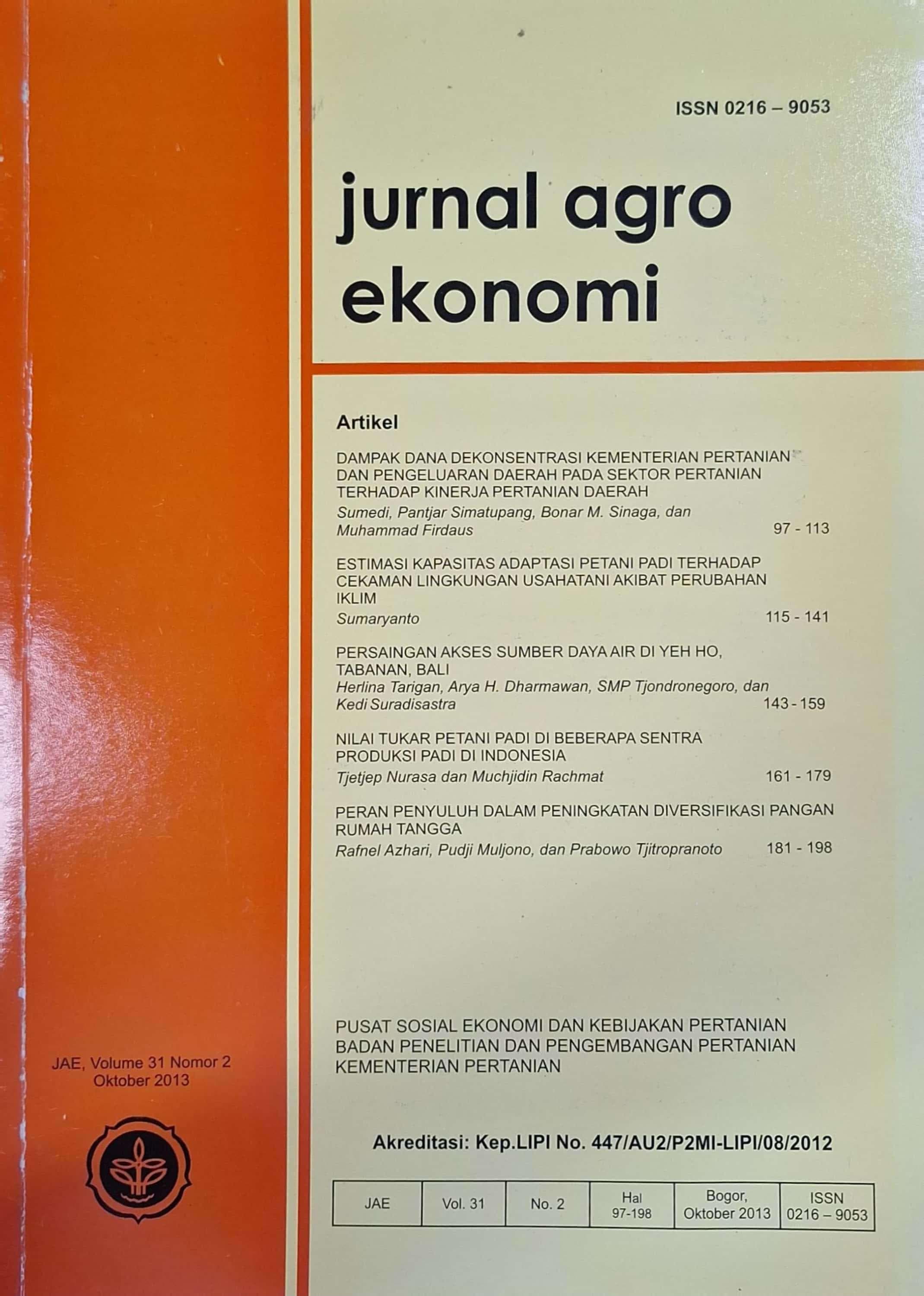 505 # # $a DAMPAK DANA DEKONSENTRASI KEMENTERIAN PERTANIAN DAN PENGELUARAN DAERAH PADA SEKTOR PERTANIAN TERHADAP KINERJA PERTANIAN DAERAH Sumedi, Pantjar Simatupang, Bonar M. Sinaga, dan Muhammad Firdaus 97-113 ESTIMASI KAPASITAS ADAPTASI PETANI PADI TERHADAP CEKAMAN LINGKUNGAN USAHATANI AKIBAT PERUBAHAN IKLIM Sumaryanto 115-141 PERSAINGAN AKSES SUMBER DAYA AIR DI YEH HO, TABANAN, BALI Herlina Tarigan, Arya H. Dharmawan, SMP Tjondronegoro, dan Kedi Suradisastra 143-159 NILAI TUKAR PETANI PADI DI BEBERAPA SENTRA PRODUKSI PADI DI INDONESIA Tjetjep Nurasa dan Muchjidin Rachmat 161-179 PERAN PENYULUH DALAM PENINGKATAN DIVERSIFIKASI PANGAN RUMAH TANGGA Rafnel Azhari, Pudji Muljono, dan Prabowo Tjitropranoto 181-198