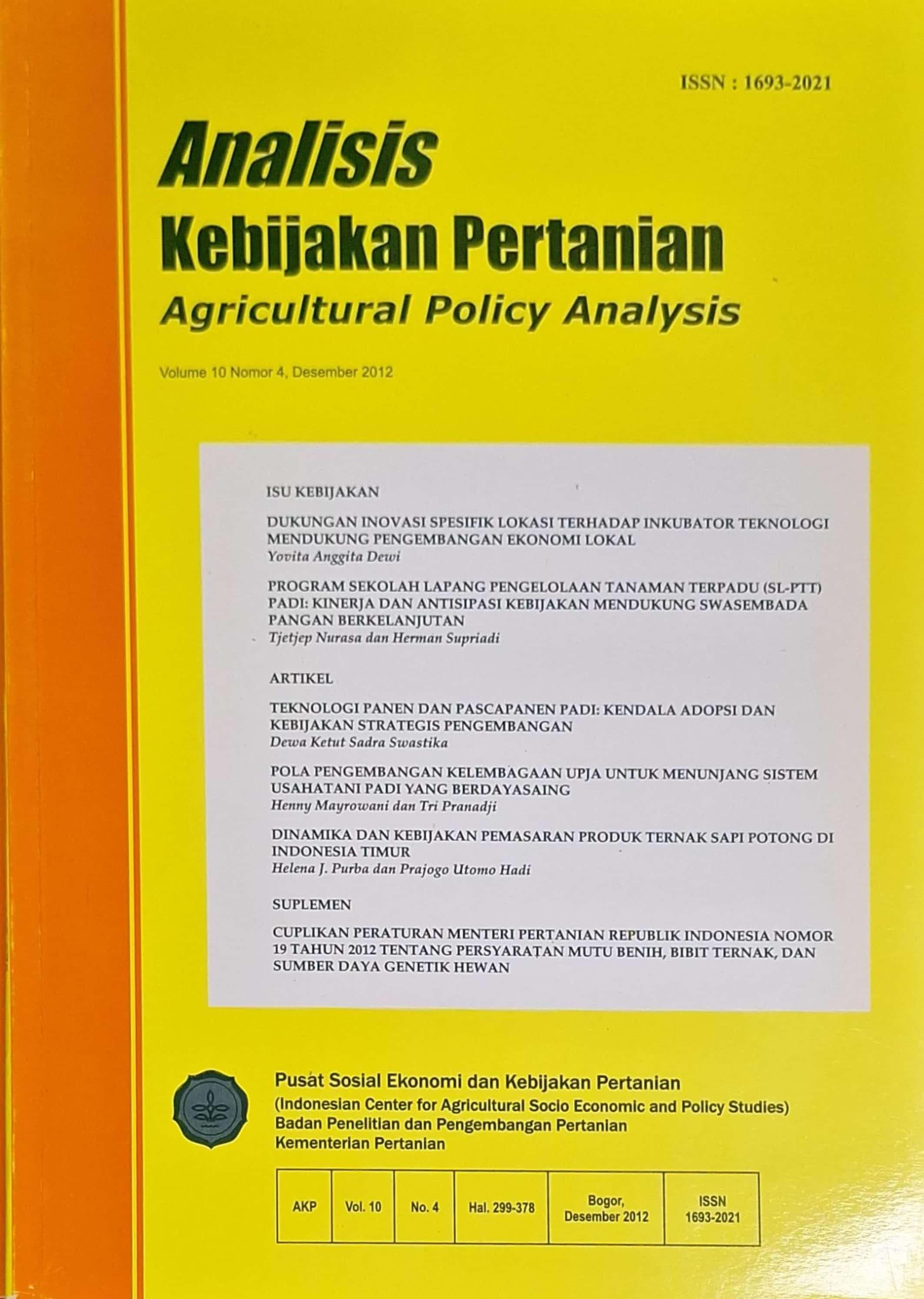 | Catatan | ISU KEBIJAKAN DUKUNGAN INOVASI SPESIFIK LOKASI TERHADAP INKUBATOR TEKNOLOGI MENDUKUNG PENGEMBANGAN EKONOMI LOKAL Yovita Anggita Dewi PROGRAM SEKOLAH LAPANG PENGELOLAAN TANAMAN TERPADU (SL-PTT) PADI: KINERJA DAN ANTISIPASI KEBIJAKAN MENDUKUNG SWASEMBADA PANGAN BERKELANJUTAN Tjetjep Nurasa dan Herman Supriadi ARTIKEL TEKNOLOGI PANEN DAN PASCAPANEN PADI: KENDALA ADOPSI DAN KEBIJAKAN STRATEGIS PENGEMBANGAN Dewa Ketut Sadra Swastika POLA PENGEMBANGAN KELEMBAGAAN UPJA UNTUK MENUNJANG SISTEM USAHATANI PADI YANG BERDAYASAING Henny Mayrowani dan Tri Pranadji DINAMIKA DAN KEBIJAKAN PEMASARAN PRODUK TERNAK SAPI POTONG DI INDONESIA TIMUR Helena J. Purba dan Prajogo Utomo Hadi SUPLEMEN CUPLIKAN PERATURAN MENTERI PERTANIAN REPUBLIK INDONESIA NOMOR 19 TAHUN 2012 TENTANG PERSYARATAN MUTU BENIH, BIBIT TERNAK, DAN SUMBER DAYA GENETIK HEWAN |