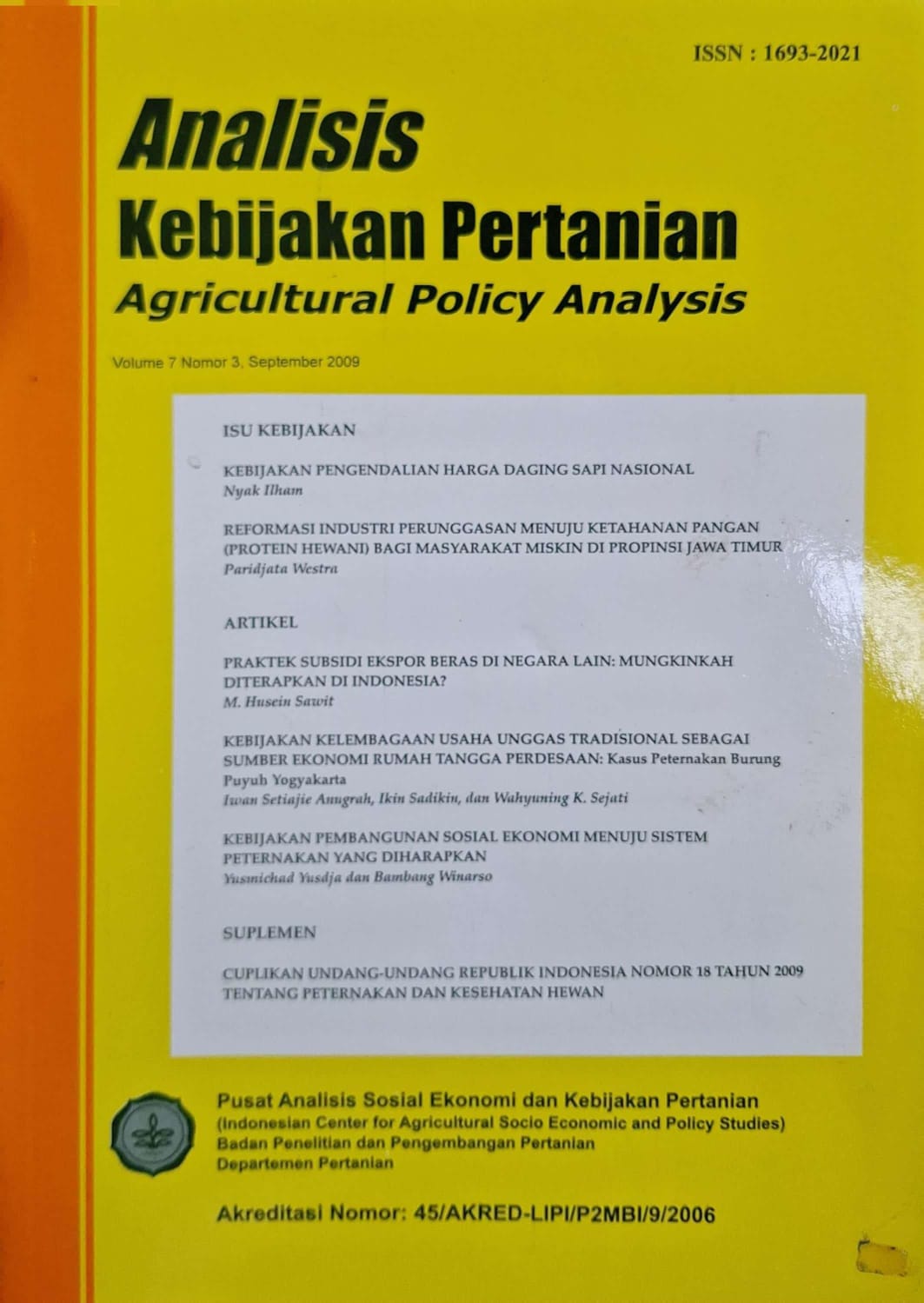 Catatan ISU KEBIJAKAN KEBIJAKAN PENGENDALIAN HARGA DAGING SAPI NASIONAL Nyak Ilham REFORMASI INDUSTRI PERUNGGASAN MENUJU KETAHANAN PANGAN (PROTEIN HEWANI) BAGI MASYARAKAT MISKIN DI PROPINSI JAWA TIMUR Paridjata Westra ARTIKEL PRAKTEK SUBSIDI EKSPOR BERAS DI NEGARA LAIN: MUNGKINKAH DITERAPKAN DI INDONESIA? M. Husein Sawit KEBIJAKAN KELEMBAGAAN USAHA UNGGAS TRADISIONAL SEBAGAI SUMBER EKONOMI RUMAH TANGGA PERDESAAN: Kasus Peternakan Burung Puyuh Yogyakarta Iwan Setiajie Anmgrah, Ikin Sadikin, dan Wahyuning K. Sejati KEBIJAKAN PEMBANGUNAN SOSIAL EKONOMI MENUJU SISTEM PETERNAKAN YANG DIHARAPKAN Yusmichad Yusdja dan Bambang Winarso SUPLEMEN CUPLIKAN UNDANG-UNDANG REPUBLIK INDONESIA NOMOR 18 TAHUN 2009 TENTANG PETERNAKAN DAN KESEHATAN HEWAN
