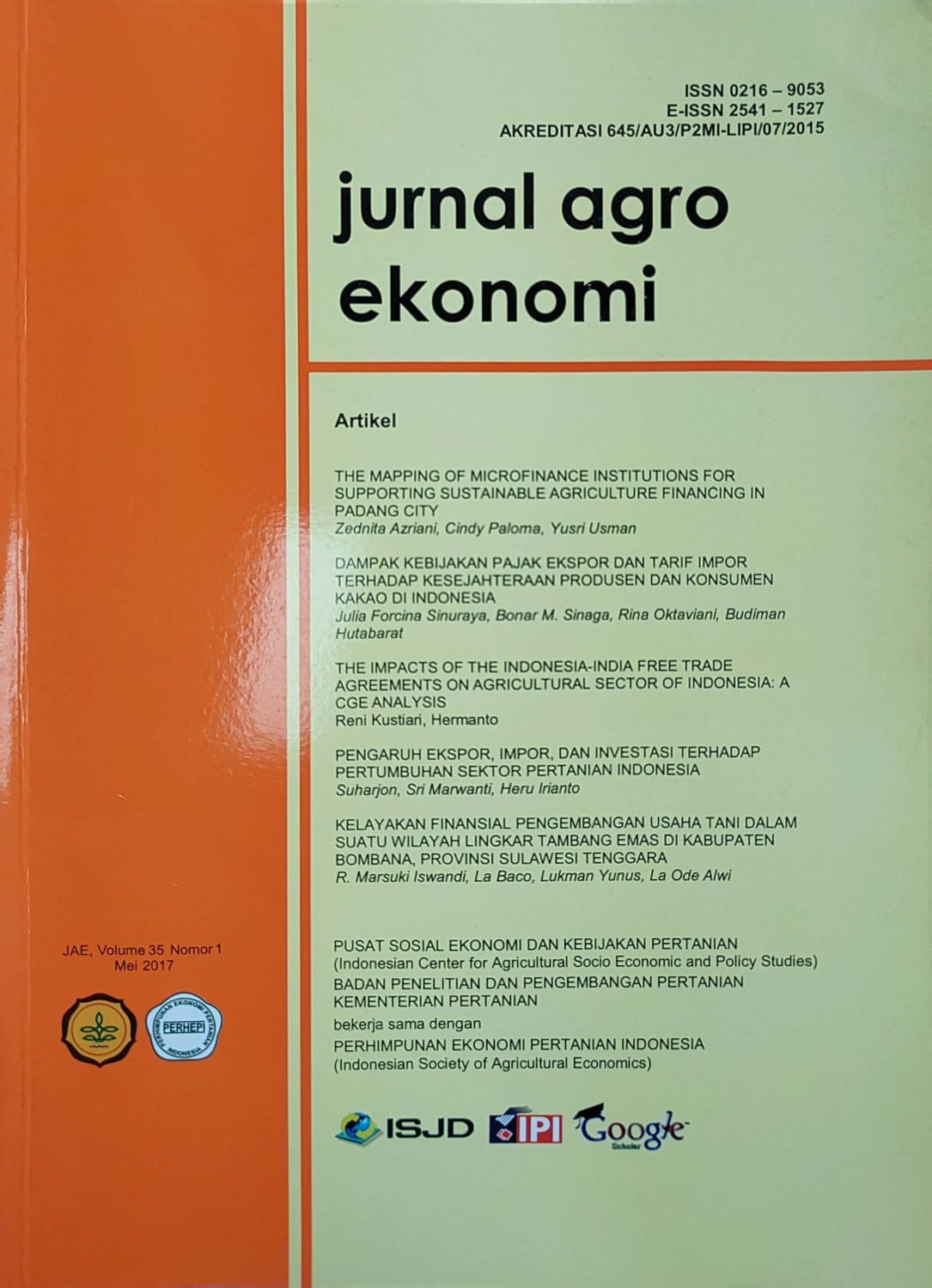 | 505 | # | # | $a THE MAPPING OF MICROFINANCE INSTITUTIONS FOR SUPPORTING SUSTAINABLE AGRICULTURE FINANCING IN PADANG CITY Zednita Azriani, Cindy Paloma, Yusri Usman DAMPAK KEBIJAKAN PAJAK EKSPOR DAN TARIF IMPOR TERHADAP KESEJAHTERAAN PRODUSEN DAN KONSUMEN KAKAO DI INDONESIA Julia Forcina Sinuraya, Bonar M. Sinaga, Rina Oktaviani, Budiman Hutabarat THE IMPACTS OF THE INDONESIA-INDIA FREE TRADE AGREEMENTS ON AGRICULTURAL SECTOR OF INDONESIA: A CGE ANALYSIS Reni Kustiari, Hermanto PENGARUH EKSPOR, IMPOR, DAN INVESTASI TERHADAP PERTUMBUHAN SEKTOR PERTANIAN INDONESIA Suharjon, Sri Marwanti, Heru Irianto KELAYAKAN FINANSIAL PENGEMBANGAN USAHA TANI DALAM SUATU WILAYAH LINGKAR TAMBANG EMAS DI KABUPATEN BOMBANA, PROVINSI SULAWESI TENGGARA R. Marsuki Iswandi, La Baco, Lukman Yunus, La Ode Alwi |
