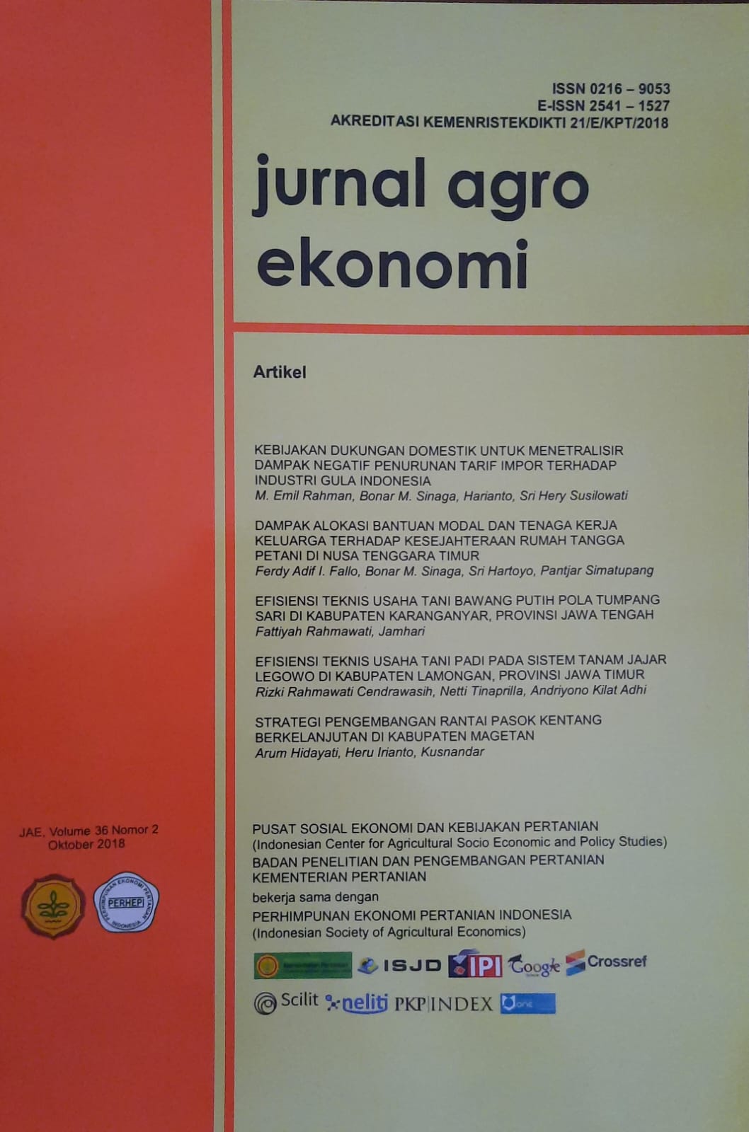| Abstrak | KEBIJAKAN DUKUNGAN DOMESTIK UNTUK MENETRALISIR DAMPAK NEGATIF PENURUNAN TARIF IMPOR TERHADAP INDUSTRI GULA INDONESIA M. Emil Rahman, Bonar M. Sinaga, Harianto, Sri Hery Susilowati DAMPAK ALOKASI BANTUAN MODAL DAN TENAGA KERJA KELUARGA TERHADAP KESEJAHTERAAN RUMAH TANGGA PETANI DI NUSA TENGGARA TIMUR Ferdy Adif I. Fallo, Bonar M. Sinaga, Sri Hartoyo, Pantjar Simatupang EFISIENSI TEKNIS USAHA TANI BAWANG PUTIH POLA TUMPANG SARI DI KABUPATEN KARANGANYAR, PROVINSI JAWA TENGAH Fattiyah Rahmawati, Jamhari EFISIENSI TEKNIS USAHA TANI PADI PADA SISTEM TANAM JAJAR LEGOWO DI KABUPATEN LAMONGAN, PROVINSI JAWA TIMUR Rizki Rahmawati Cendrawasih, Netti Tinaprilla, Andriyono Kilat Adhi STRATEGI PENGEMBANGAN RANTAI PASOK KENTANG BERKELANJUTAN DI KABUPATEN MAGETAN Arum Hidayati, Heru Irianto, Kusnandar |